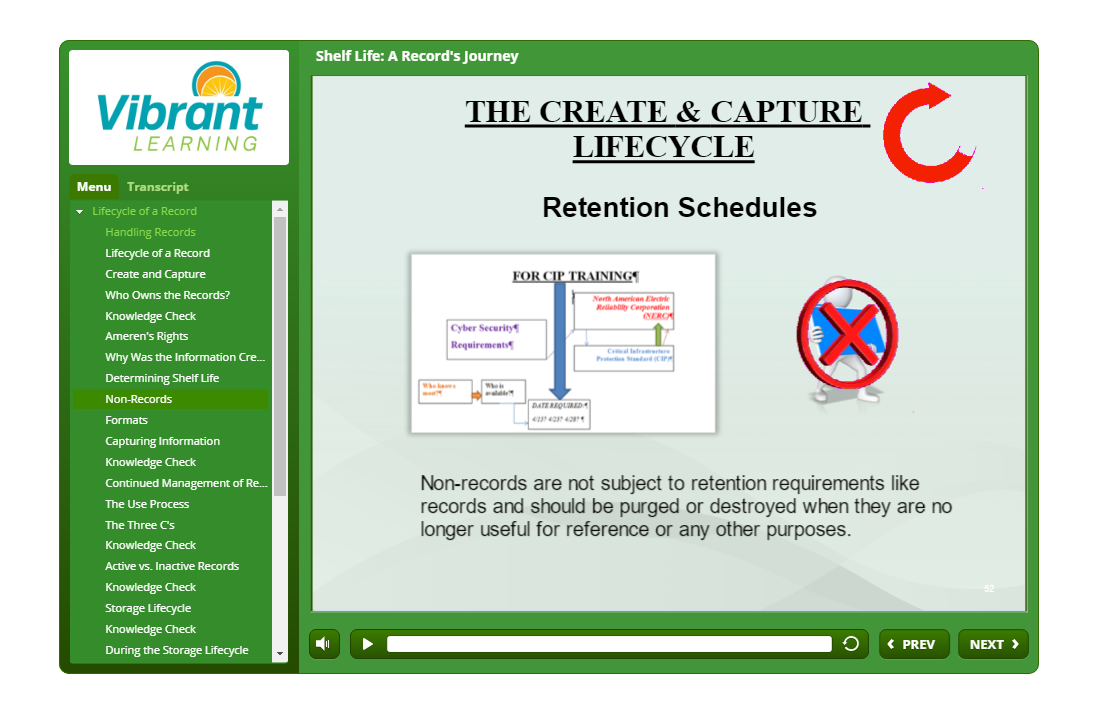 For this project, Vibrant Learning was contracted by a US-based energy company to convert a PowerPoint deck into an eLearning course. The course content focused on the management and security of digital records within the company’s intranet.
